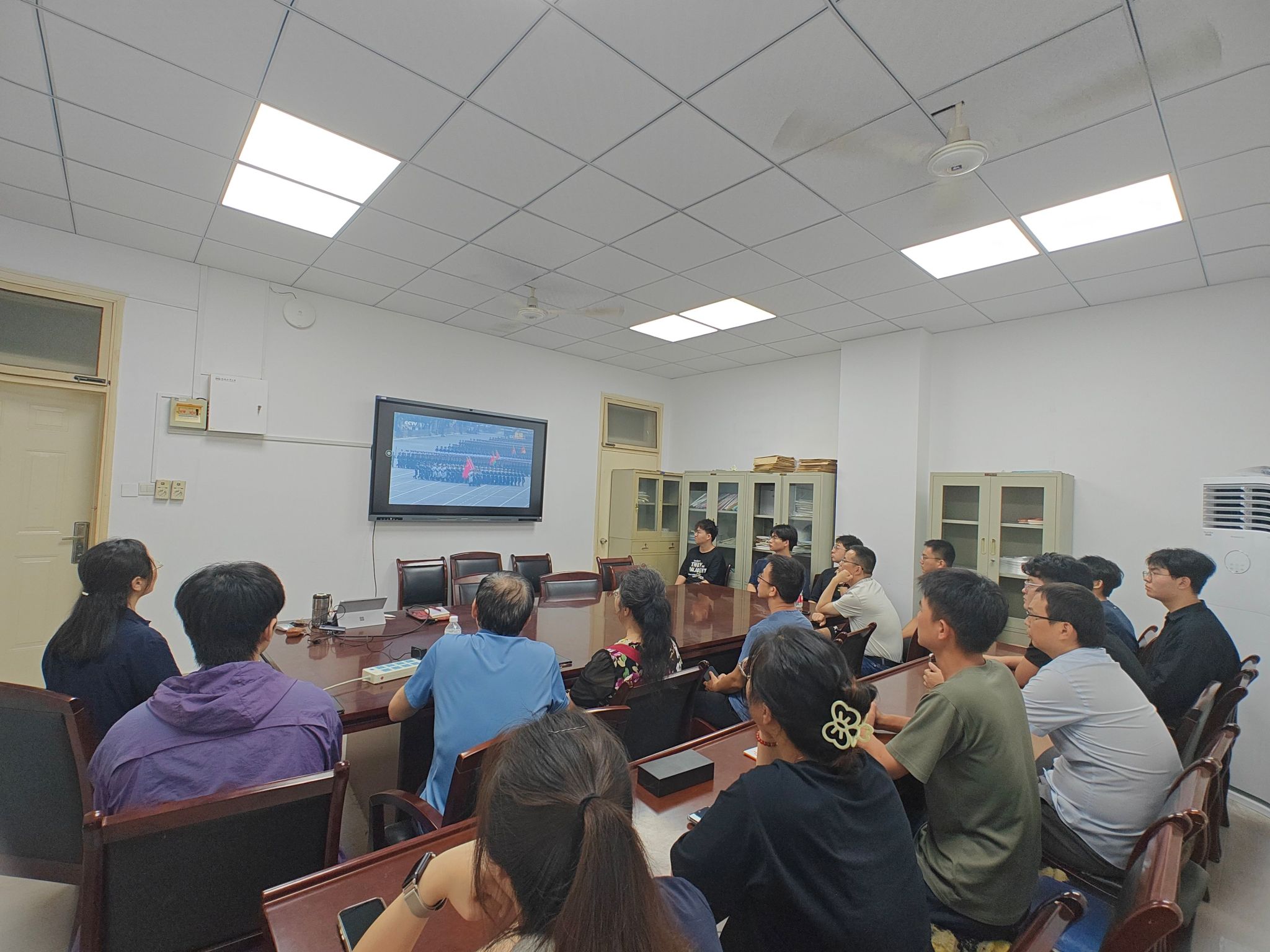 9月3日上午,机械设计系教工党支部与研究生党支部联合组织党员在格物楼三楼会议室集中观看9月3日阅兵仪式直播,以共沐国威军威的方式深化党史学习教育,强化党团联动育人成效。本次活动由机械设计系教工支部书记朱立红统筹协调,师生党员齐聚一堂,共同见证这一庄严而激动人心的时刻,现场氛围庄重热烈。