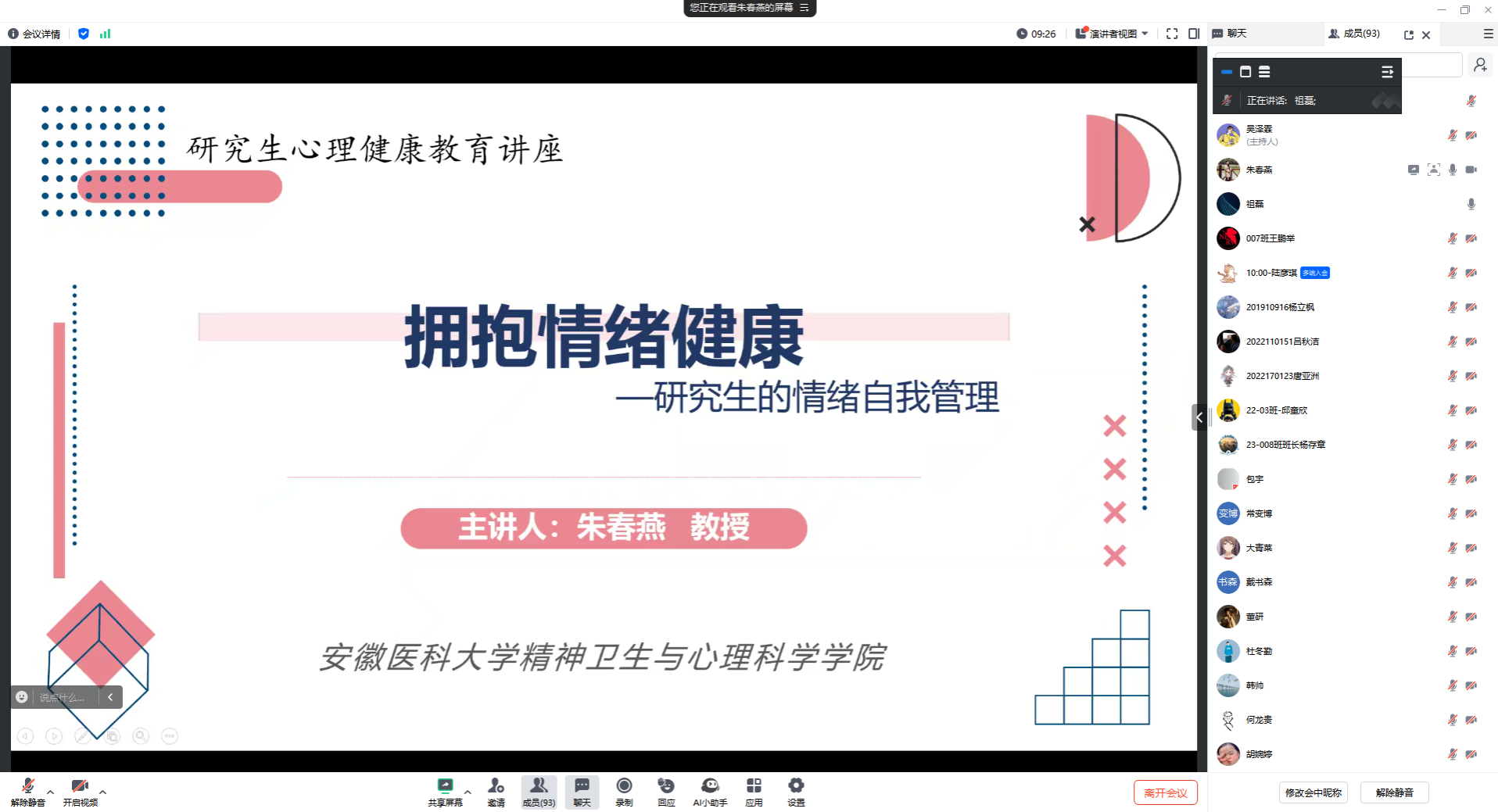 线上举办了“拥抱情绪健康---研究生的情绪自我管理”主题报告会。本次报告邀请了安徽医科大学精神卫生与心理科学学院院长朱春燕教授担任主讲人,报告会由4虎