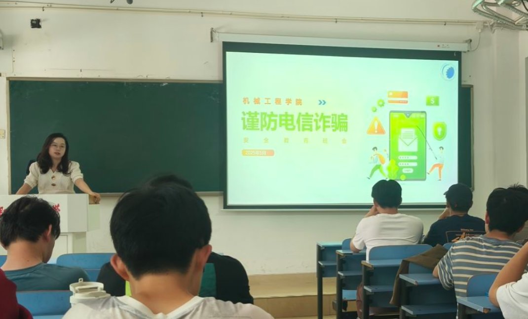 举办“筑牢安全防线防范电信诈骗”安全教育主题班会,学院2023级辅导员丁玲老师结合最新电信诈骗案例,为同学们系统讲解了新型诈骗手段与防范策略,工业工程23-2班40余名学生参加活动。
