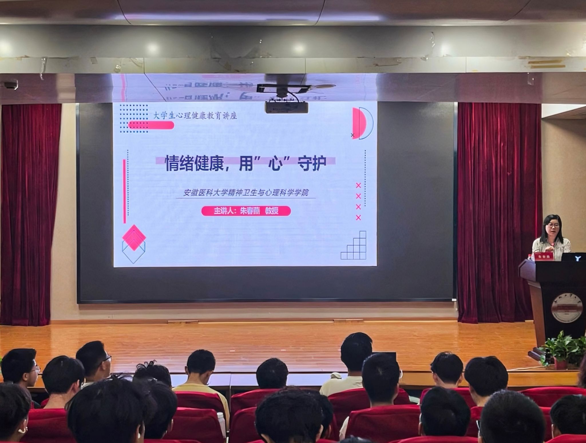 于5月28日在翡翠湖校区建艺馆报告厅成功举办“情绪健康,用心守护”主题讲座,本次讲座邀请安徽医科大学精神卫生与心理科学学院院长朱春燕教授担任主讲人,全院学生通过线上线下双渠道参与,覆盖人数逾500人。