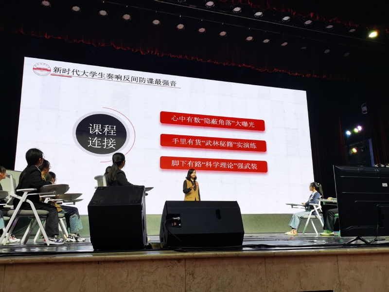展示以模拟授课形式进行。丁玲以“新时代大学生奏响反间防谍最强音”为主题,选取大学生网上冲浪、课题研究、实习兼职、社交活动、出境留学五个篇章为切入点,采取案例教学、小组讨论与情景模拟等教学手段,结合《国家安全法》《反间谍法》等相关法律条文的解读,对“反间防谍是什么”、“为什么要在大学生中开展反间防谍教育”、“反间防谍应该怎么做”等问题进行了深入浅出的讲解,将思政育人理念融入国家安全教育。