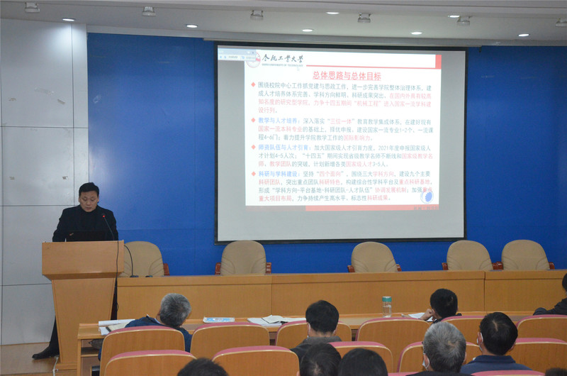 院长訾斌首先介绍了十四五期间学院发展的总体思路与总体目标,随后结合2021年学院重点工作,从党建与思想政治工作、学科建设、教学科研、人才培养、师资队伍建设等方面详细解读了学院各项工作的重点举措。他指出,要围绕校院中心工作抓党建与思想政治工作,进一步深化学院治理体系和治理能力建设;深入落实“立德树人、能力导向、创新创业”三位一体教育教学集成体系,扎实推进教学与人才培养工作;加大高层次人才引育力度,全力建设一流师资队伍;坚持“四个面向”,围绕三大学科方向,重点建设九个科研团队,突出重点团队科研特色,努力开创学院科研与学科建设水平新局面。