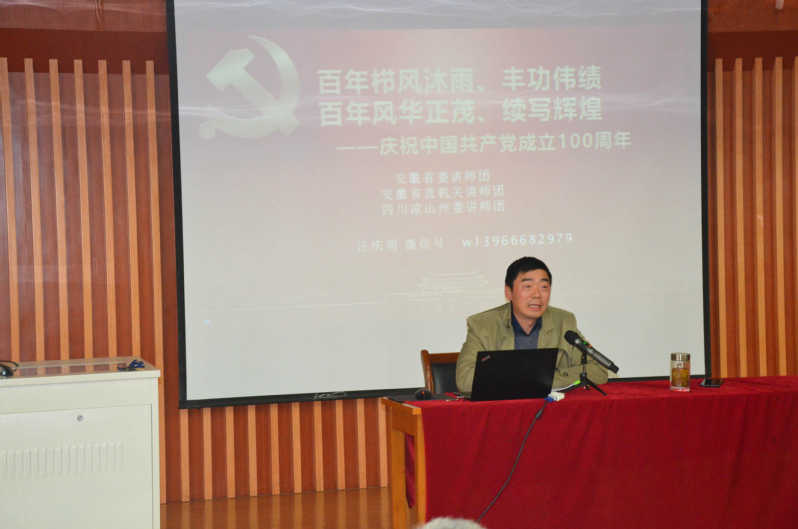 在机械楼214学术报告厅举行党史学习教育专题辅导报告会,安徽省委讲师团、安徽省直机关讲师团宣讲专家汪庆明教授应邀为学院师生党员作题为《百年栉风沐雨,铸就丰功伟绩》的专题报告,学院全体教职工党员和学生党支部支委会成员参加了报告会。报告会由学院正处级组织员张显东主持。