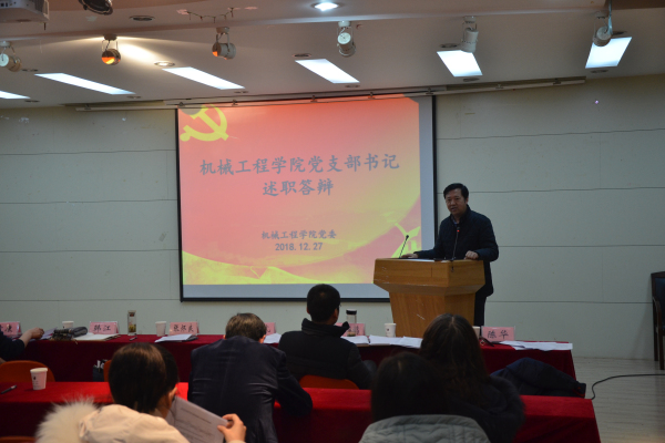 为深入贯彻落实习近平新时代中国特色社会主义思想和党的十九大精神情况,全国高校思想政治工作会议、全国组织工作会议、全国教育大会精神等落实情况,继续推进“两学一做”教育制度化常态化,我院于12月27日在格物楼316举行2018年度基层党支部书记述职答辩评议会,参加此次评议的有我院党建组织员张怀良,我院党委委员韩江、訾斌、黄康、黄海鸿、郑召丽、刘焜、陈华,各年级辅导员,全体基层教工党支部书记。会议由学院党委书记韩江主持。