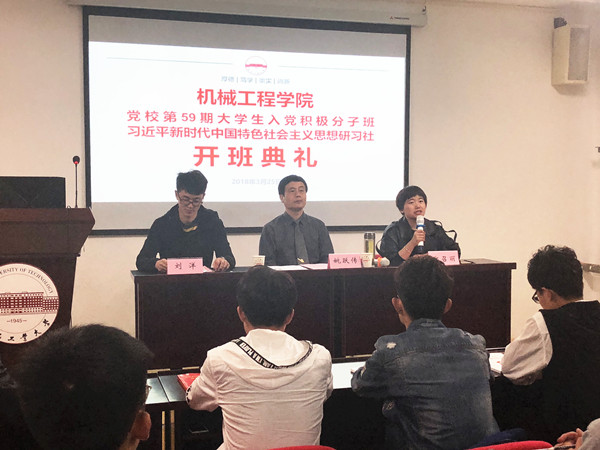 仪式上,研习社班主任刘洋老师布置了本期研习社学员班的研习计划和内容,并对培训纪律和考核评价提出了具体要求。学员代表机械设计制造及其自动化2017-7班张志伟同学代表全体学员作了发言并作出承诺。随后,院党委副书记、副院长郑召丽向全体学员提出希望和要求:一是希望同学们充分认识参加研习社的重要意义,利用集中学习和自主研修的机会,以理论武装头脑,指导实践;二是希望同学们自觉担当使命,坚定走中国特色社会主义道路的理想信念;三是希望同学们不断提高综合素质,做新时代的有志有为青年。