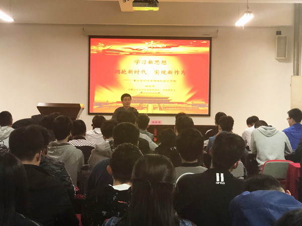 姚跃传结合党的十八大以来,我国在全面建成小康社会、全面深化改革、全面依法治国、全面从严治党以及政治、经济、文化、社会、生态、军事等领域取得的巨大成就,勉励同学们把学习新思想的成效转化为看齐党中央的政治自觉,转化为改造主观世界、锤炼坚强党性的思想自觉,转化为指导实践、努力学习的行动自觉,要结合自己的专业背景带着问题学,带着思考学,做到学有所悟、学以致用。他建议同学们结合中国共产党90多年的奋斗历史学、结合自党的十八大以来我国取得的历史性成就学、结合马克思主义基本理论和科学方法学、结合自身的学习生活学,全面领会掌握新思想,不忘初心,牢记使命,志存高远,紧跟党走,为实现中华民族伟大复兴的中国梦而努力奋斗。