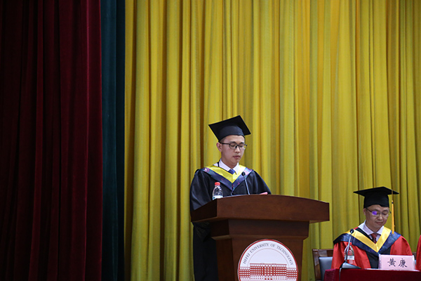 获得学士学位的同学表示热烈祝贺,并提出了殷切希望,他希望同学们要时刻不忘家国情怀,永葆创新的理念,坚持不断地学习,更要懂得感恩。希望同学们能够时刻关注母校的发展,在将来的工作生活中认真做人,踏实做事,勇于创新,成就梦想。