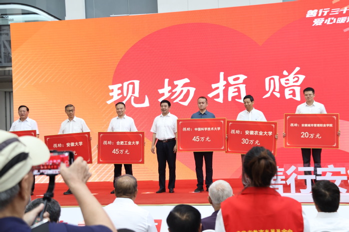 党委书记张显东应邀出席开幕式。5日当天,启动仪式在合肥骆岗中央公园举办。捐赠仪式上,安徽省慈善总会向我校教育基金会捐赠了45万元人民币,全部用于资助我校家庭经济困难学生。