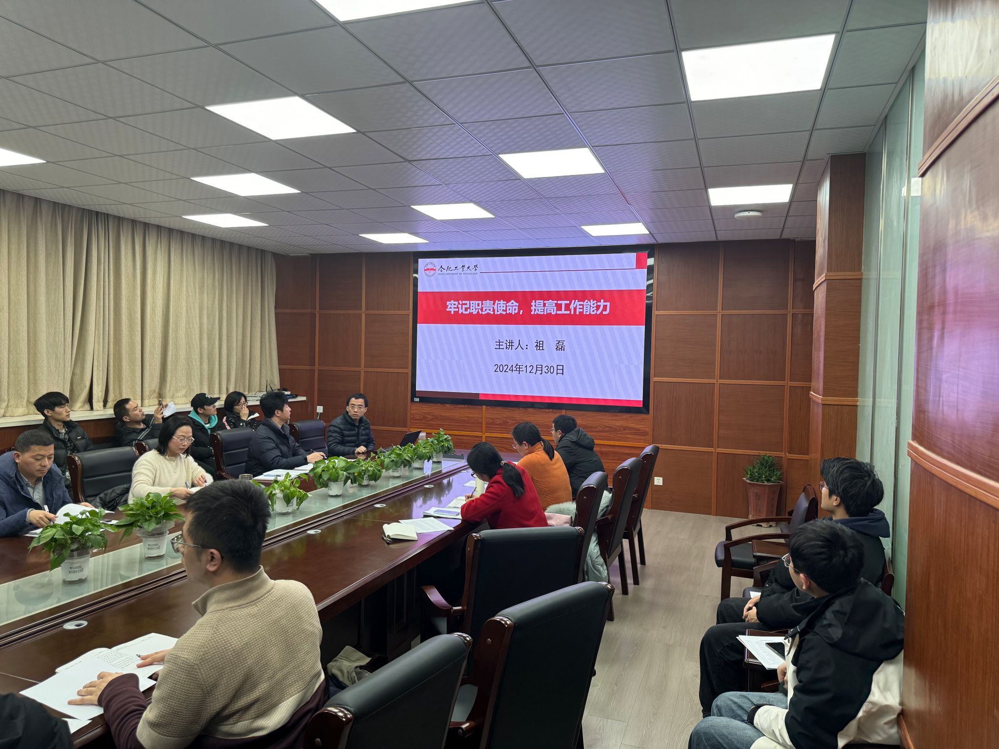 党委书记祖磊为师生党支部书记讲授党课,党课题目为“牢记职责使命 提高工作能力”,学院党委秘书、研究生辅导员和28个基层党支部书记参加了党课学习。