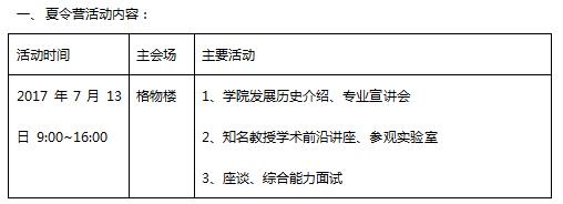 愿为热爱科研、基础扎实、素质全面、德才兼备、有志攻读硕士、博士学位的2018届本科毕业生搭建继续深造和发展的平台,提供良好的发展机遇。兹定于2017年7月12日-13日举办优秀大学生学术夏令营活动,诚挚邀请全国高校相关学科领域优秀大学生前来参加。