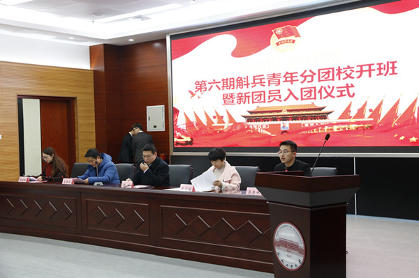 于翡翠湖校区科教楼第四会议室举行了新团员入团仪式暨第六期斛兵青年分团校开班。校团委、学院党委相关负责人、学院政工干部、130名团校学员及10名新入团团员参加了此次活动。