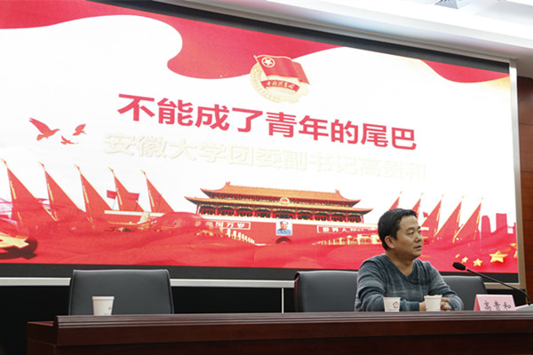 分团校的第一次授课,邀请到了安徽大学团委副书记高贵和老师,他以《不能成了青年的尾巴》为题,将马克思主义思想与中国优秀文化相结合,以自身经验为例,为在座的青年团员详细讲解了在成长过程中如何应对迷茫、如何面对挑战、如何做好学生骨干等问题。高老师“有志、立志、尽志”的观点得到广大团员的认可,鼓舞青年团员省察己身,积极上进,争做青年领袖。